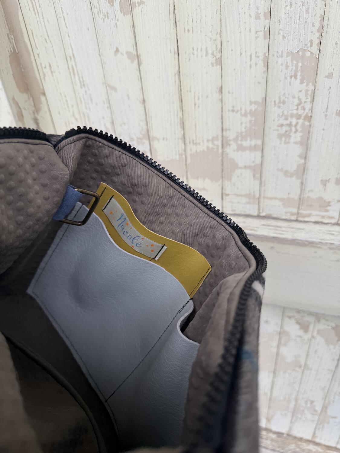 All’interno ci c’è una tasca portatessere, due tasche aperte e un anello sul lato, per agganciare le chiavi o altro.