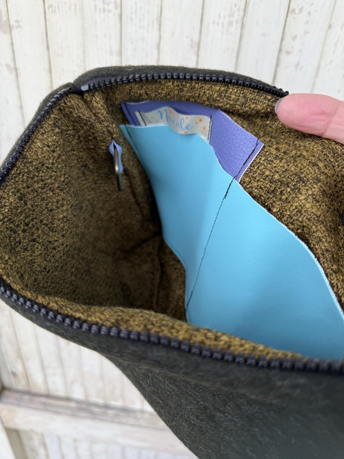 All’interno ci c’è una tasca portatessere, due tasche aperte e un anello sul lato, per agganciare le chiavi o altro.