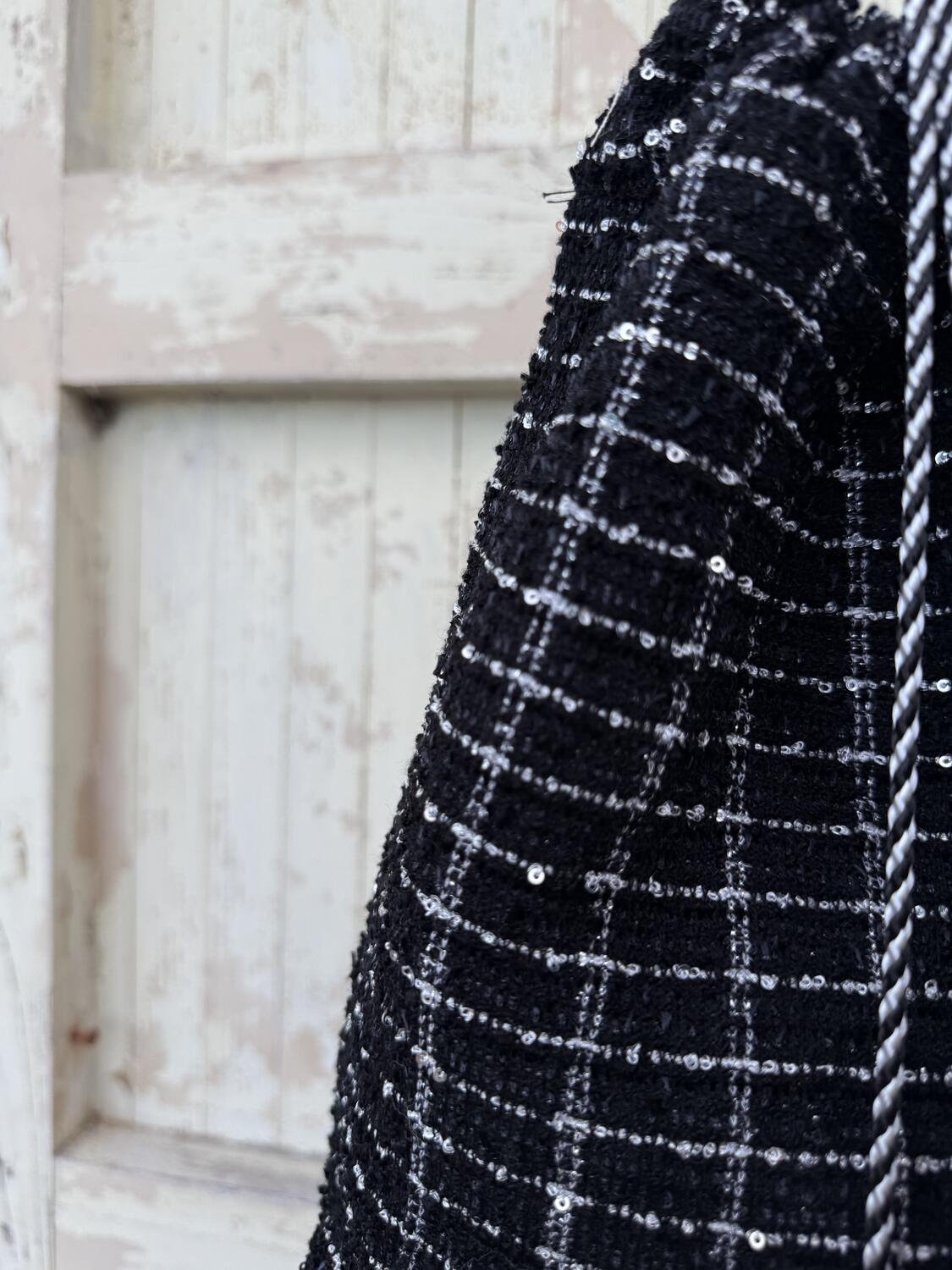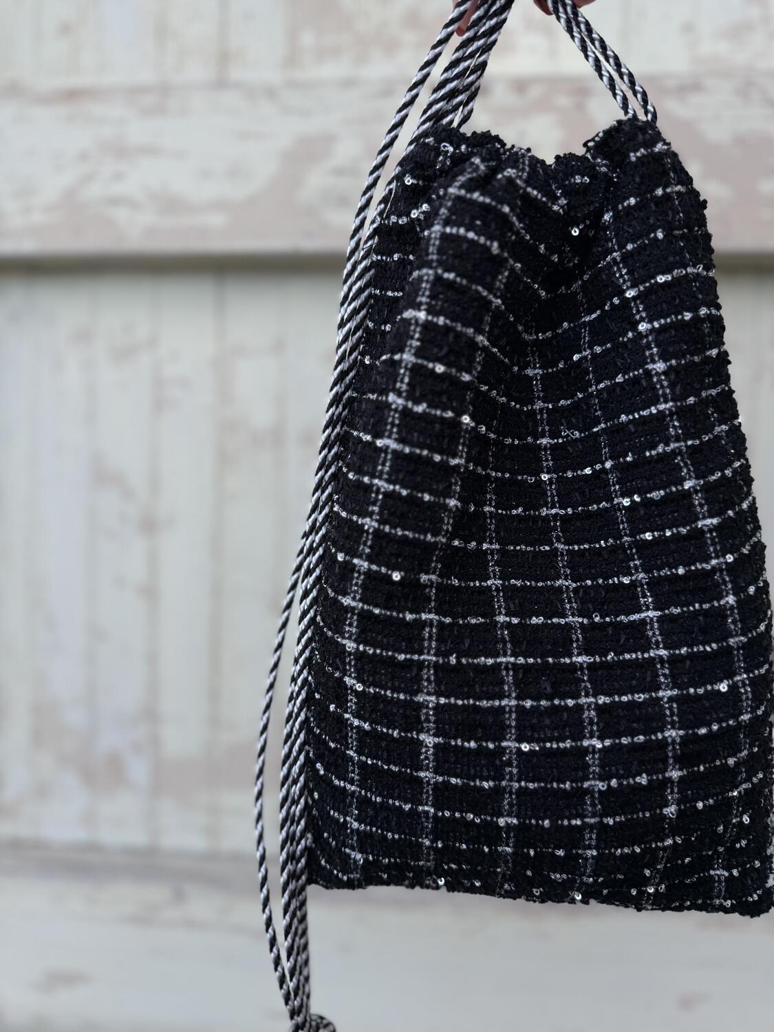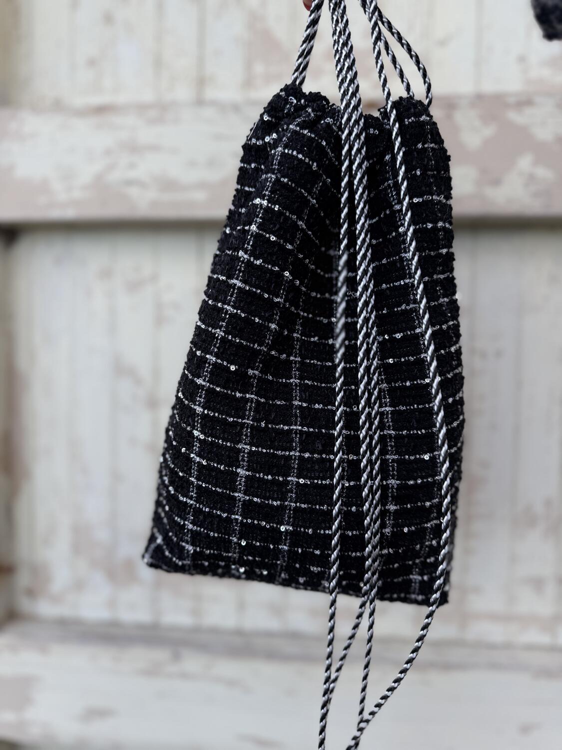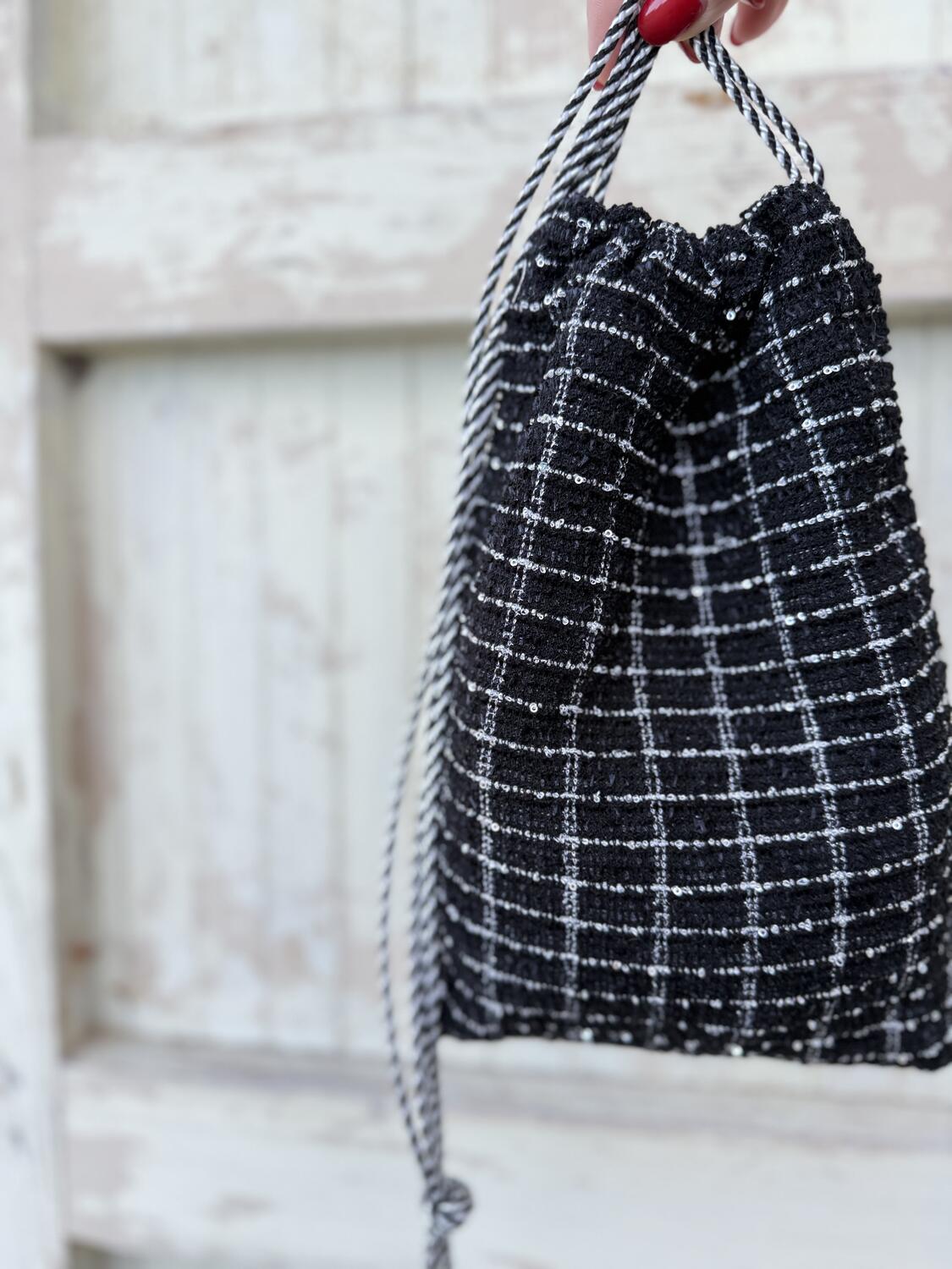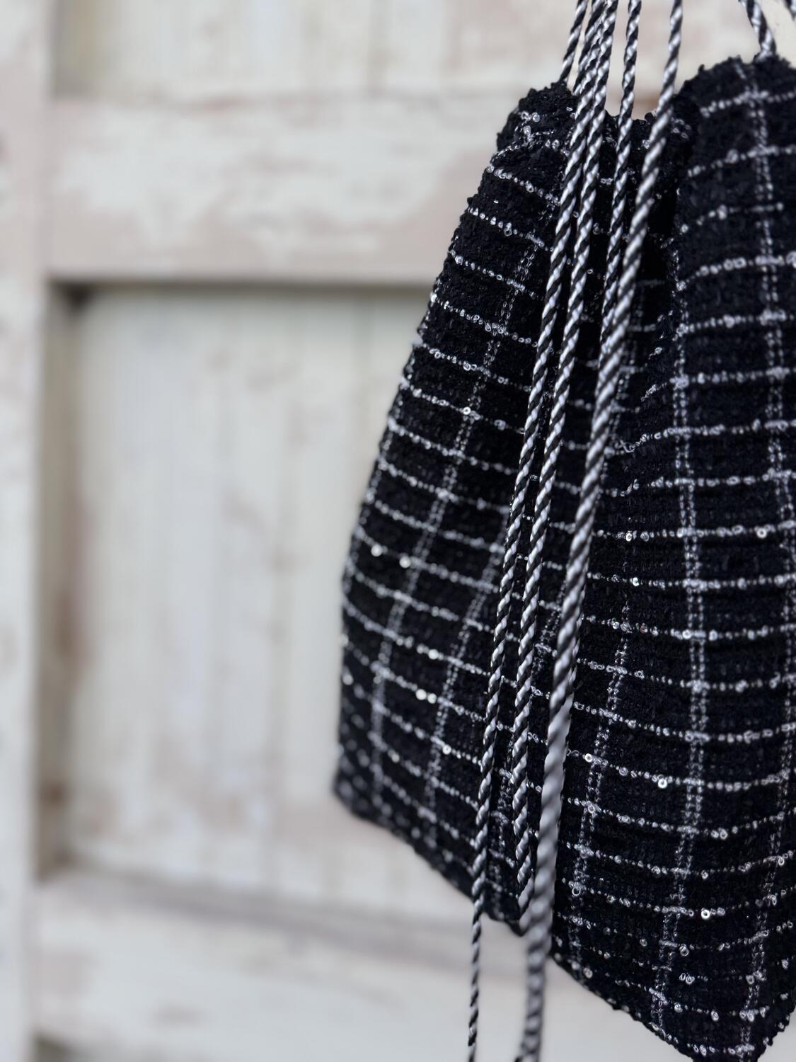 Da poter tenere a mano, a spalla o a tracolla, regolando con un semplice nodo la lunghezza della corda, foderata internamente in tessuto d’arredo