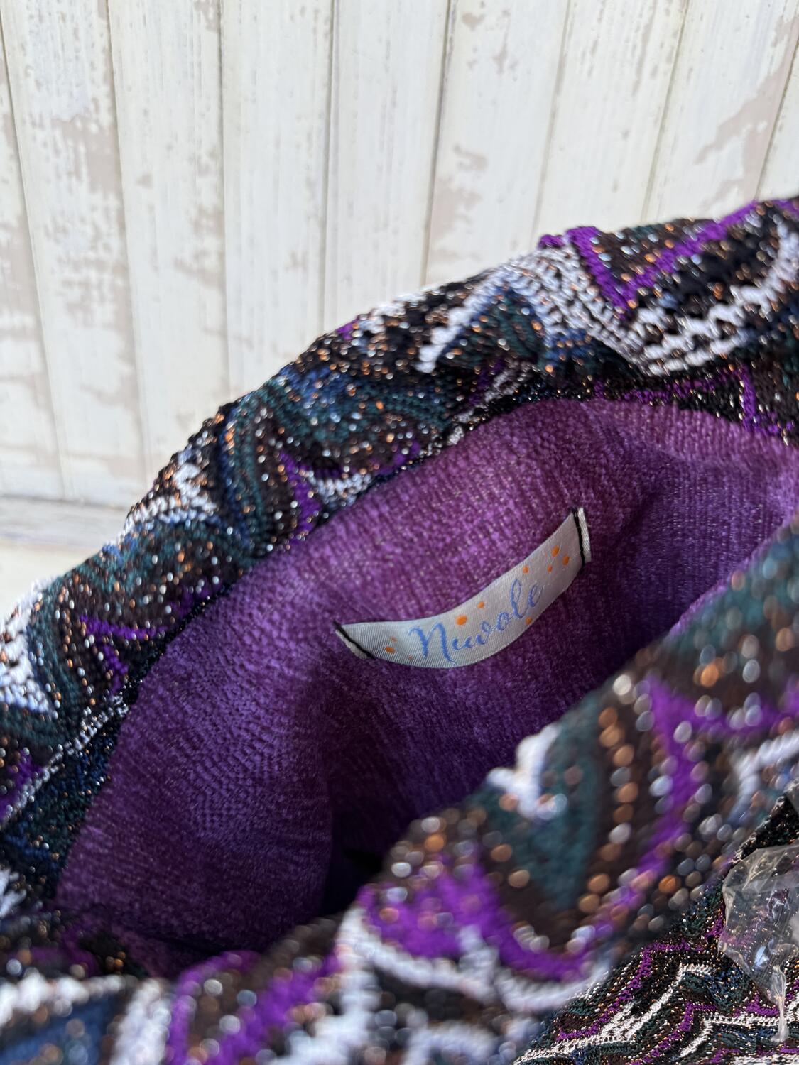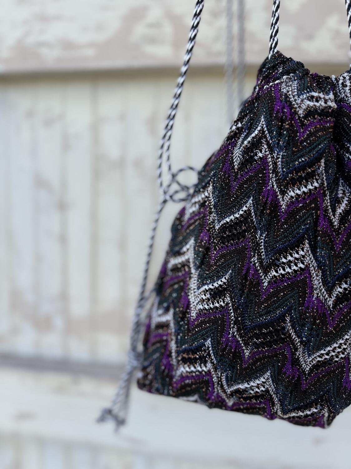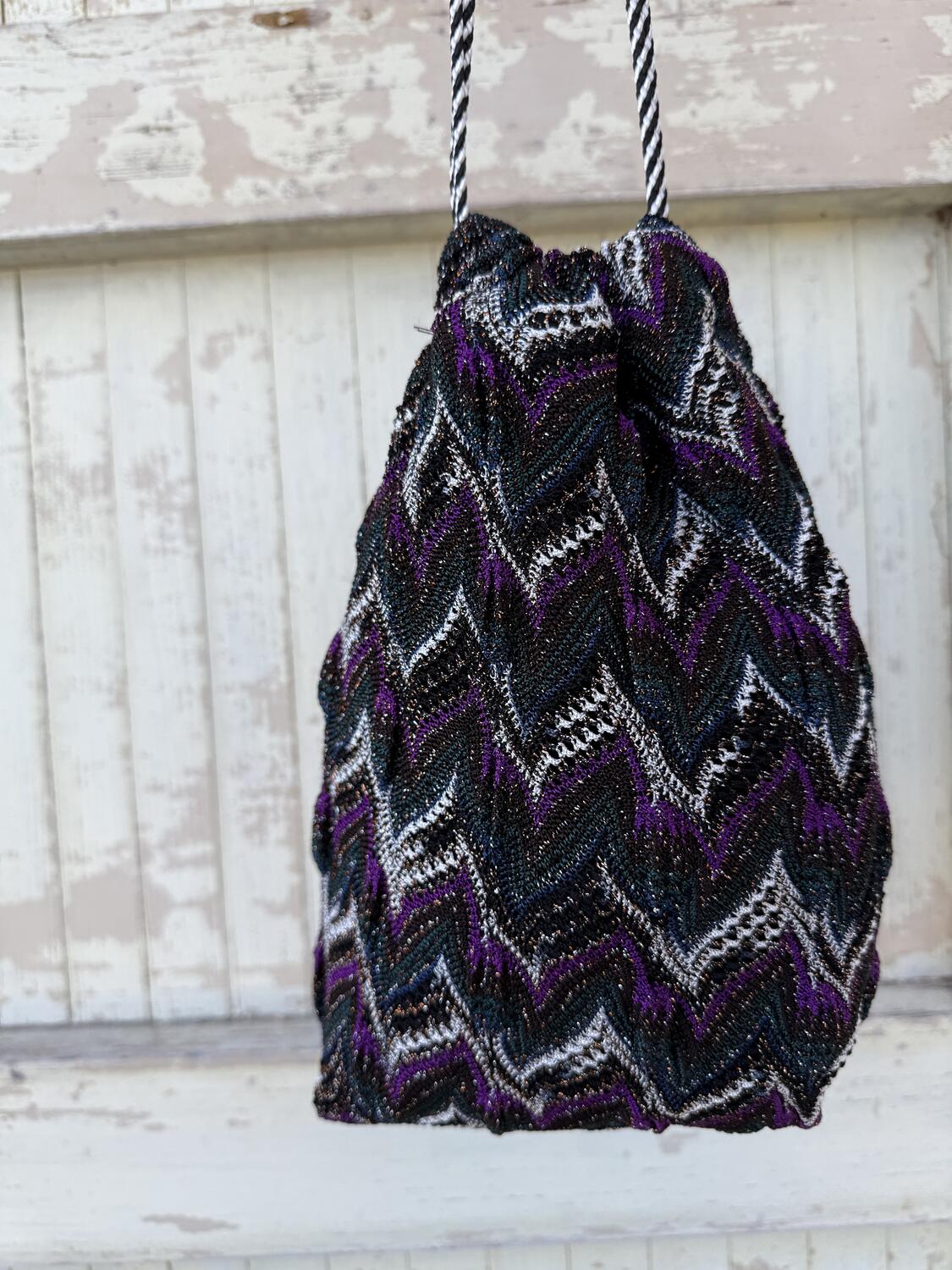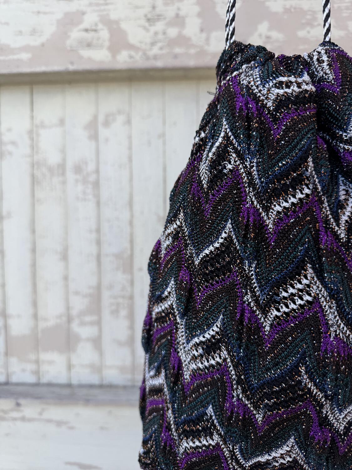 Piccola borsa a secchiello con lavorazione effetto maglia, con una elaborata laborazione con i colori: ottanio, viola, melanzana, nero e bianco, con un filo di lamè che la rende luminosa