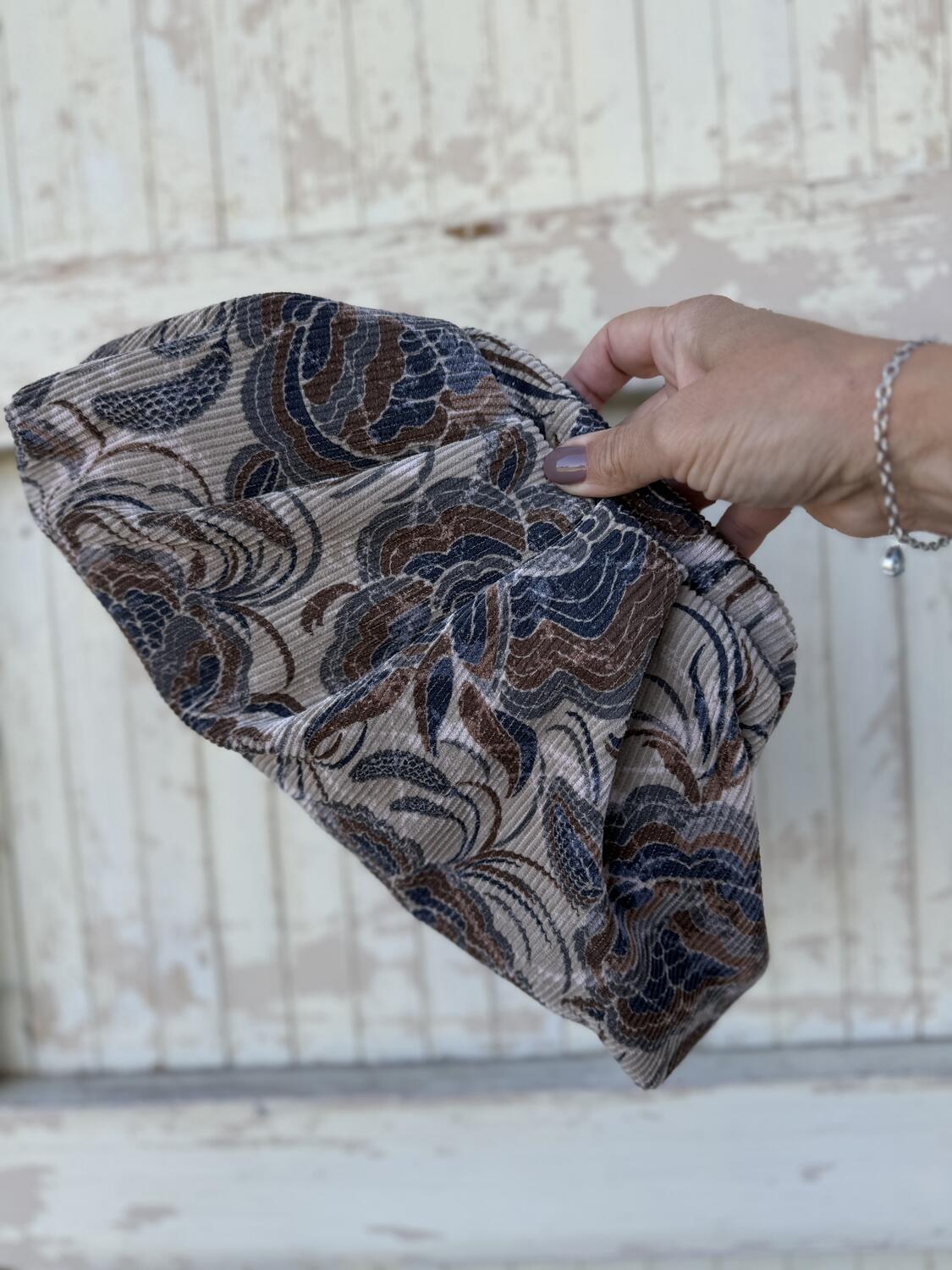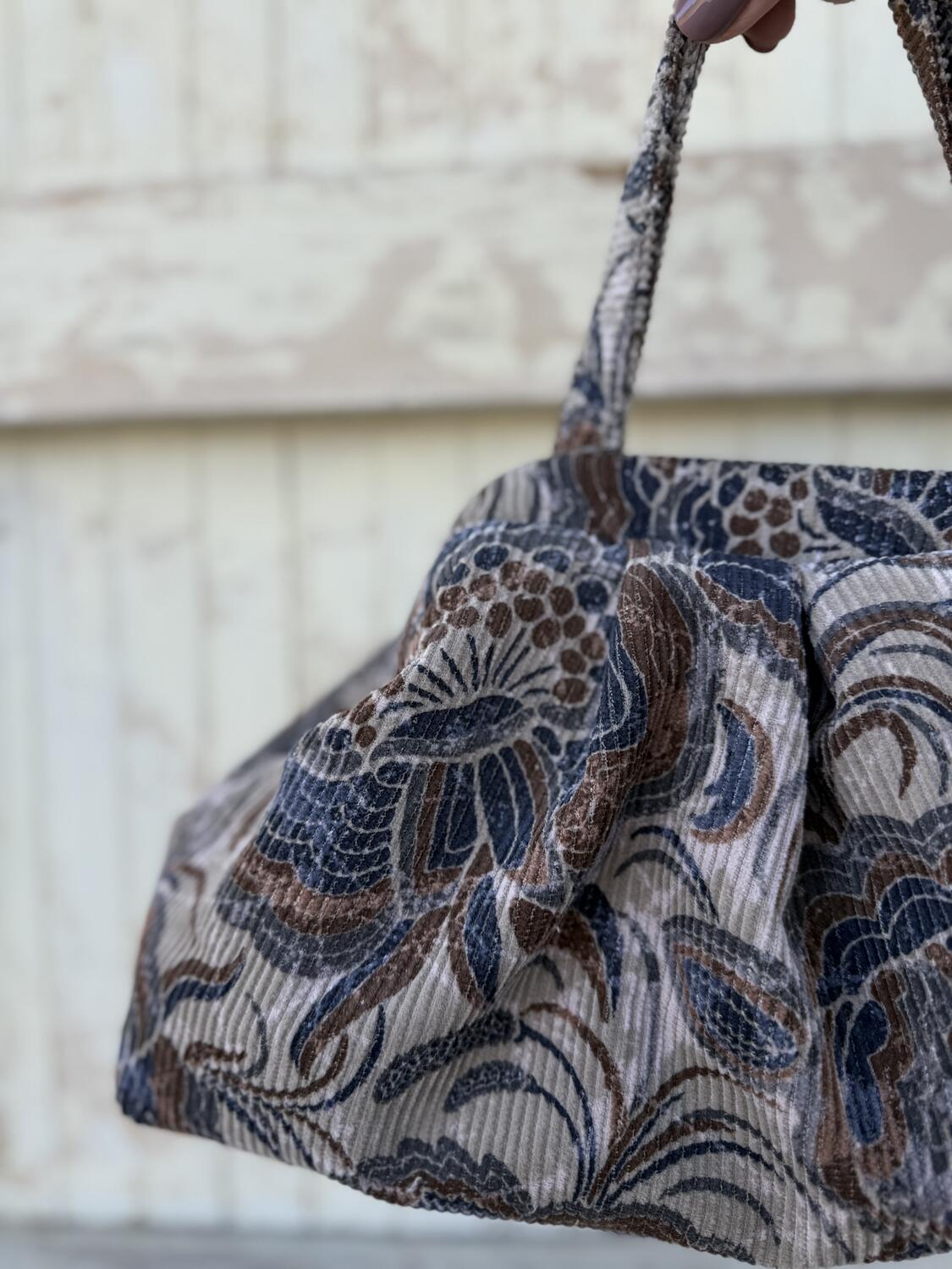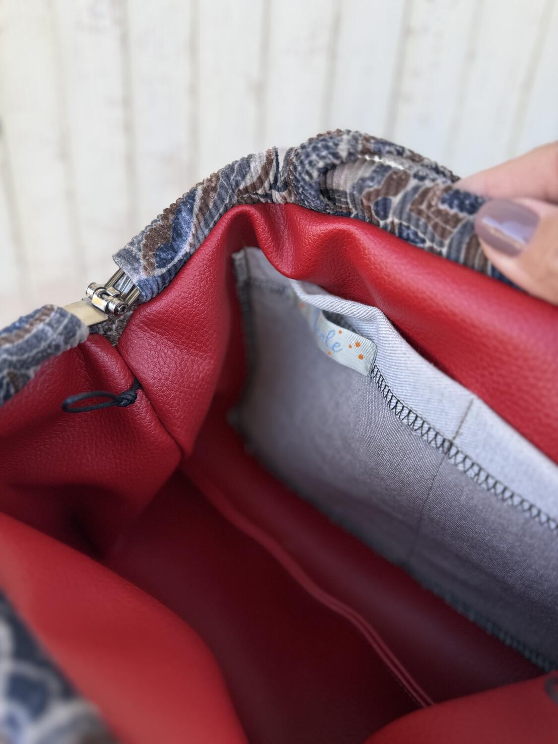 Ha all’interno due piccoli manici nello stesso tessuto che possono essere utilizzati o tenuti all’interno della borsa.