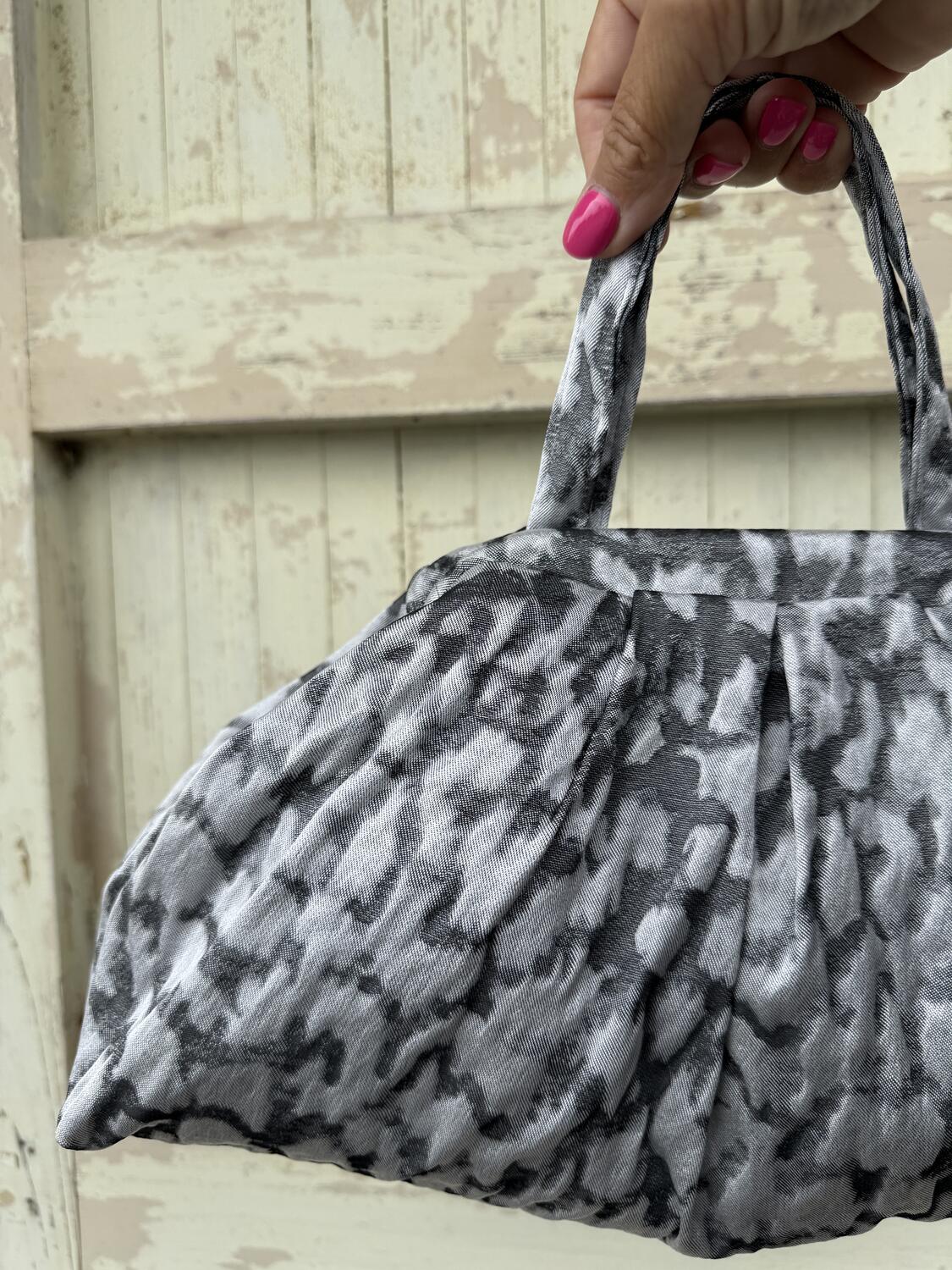 Questa soft bag è stata realizzata in tessuto d’arredo in rilievo, con effetto maculato, nelle tonalità dei grigi.