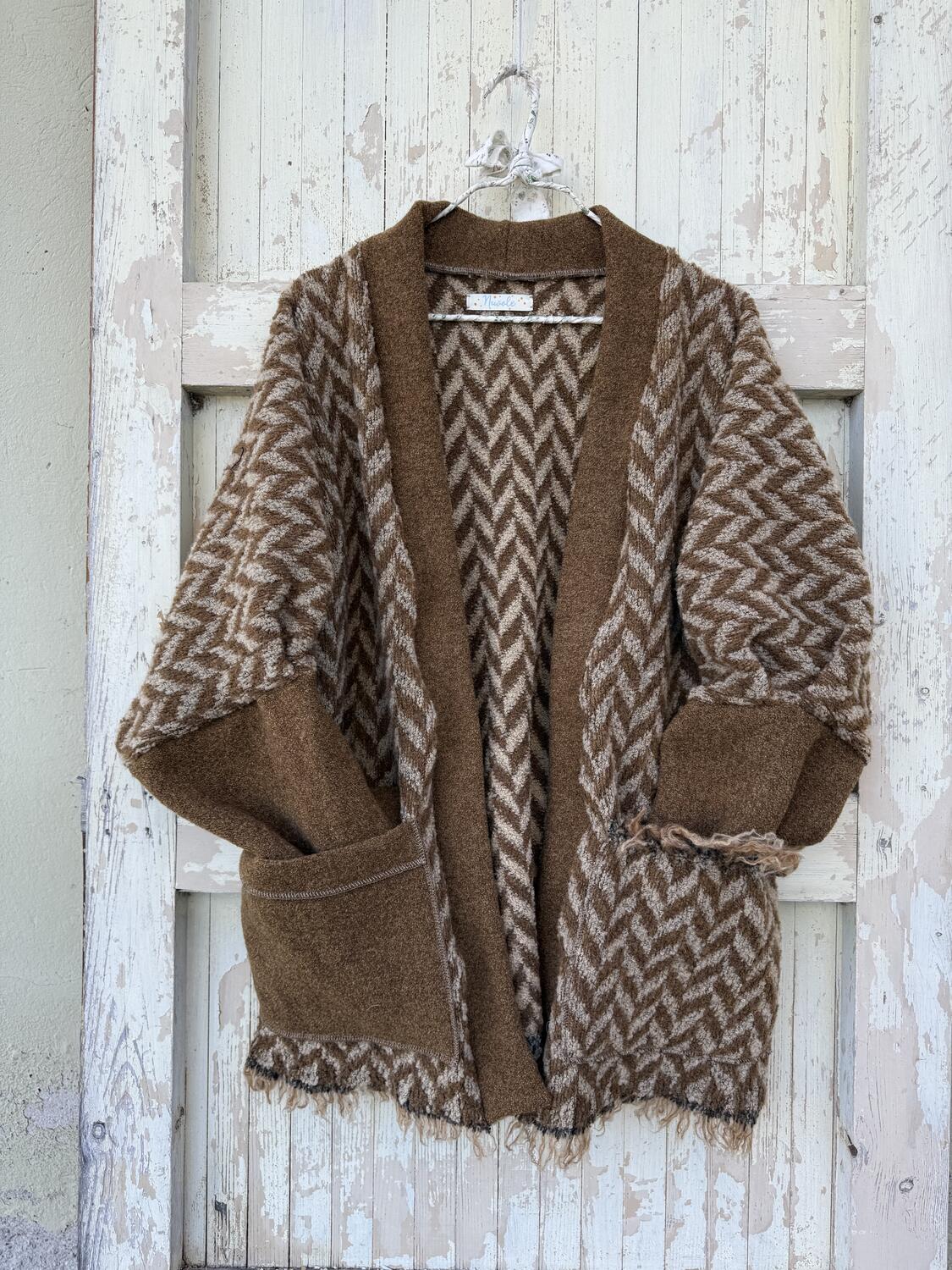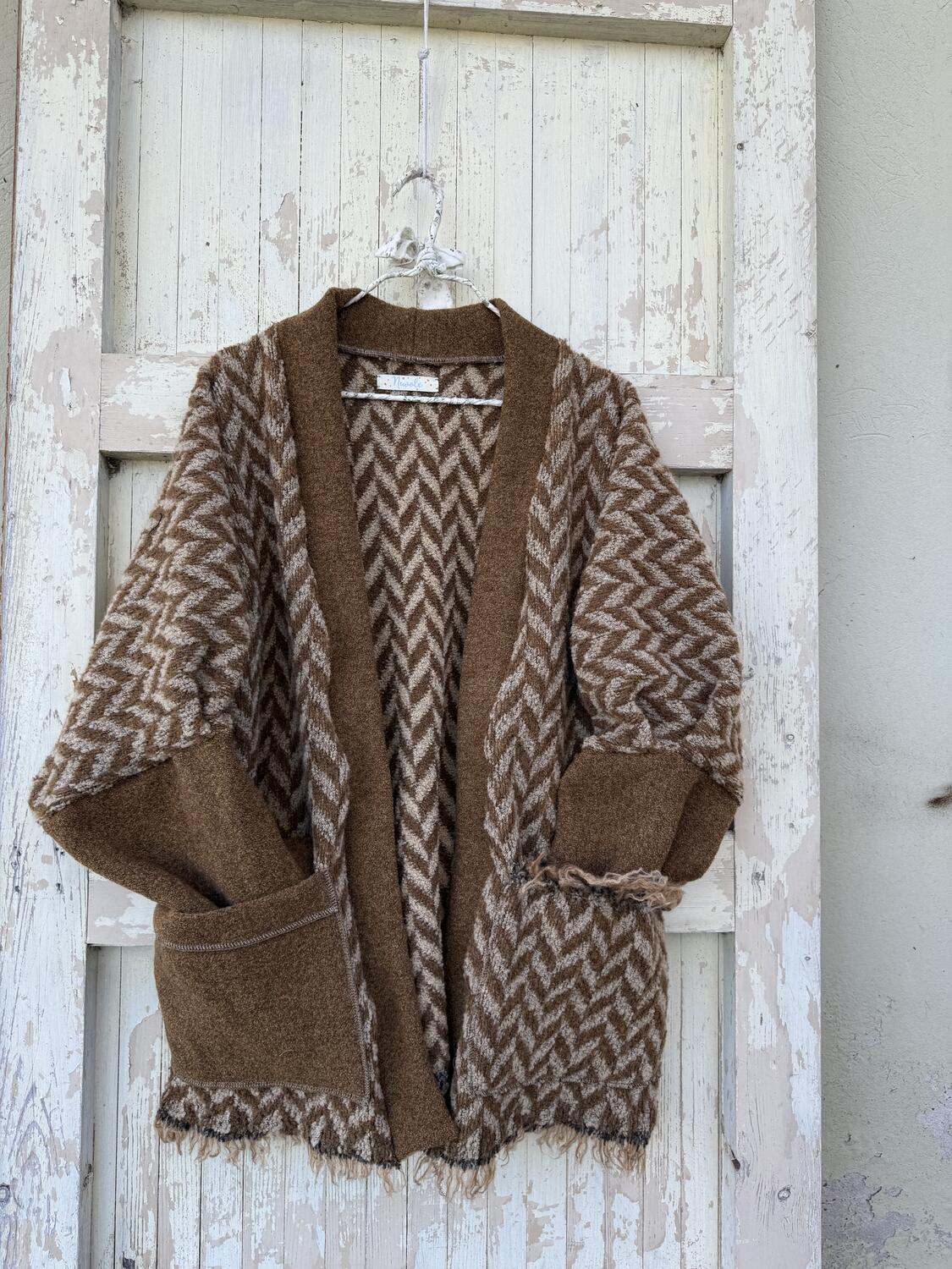 Caldo e morbido, forma a kimono, con maniche leggermente a palloncino, il bordo inferiore è stato lasciato sfrangiato