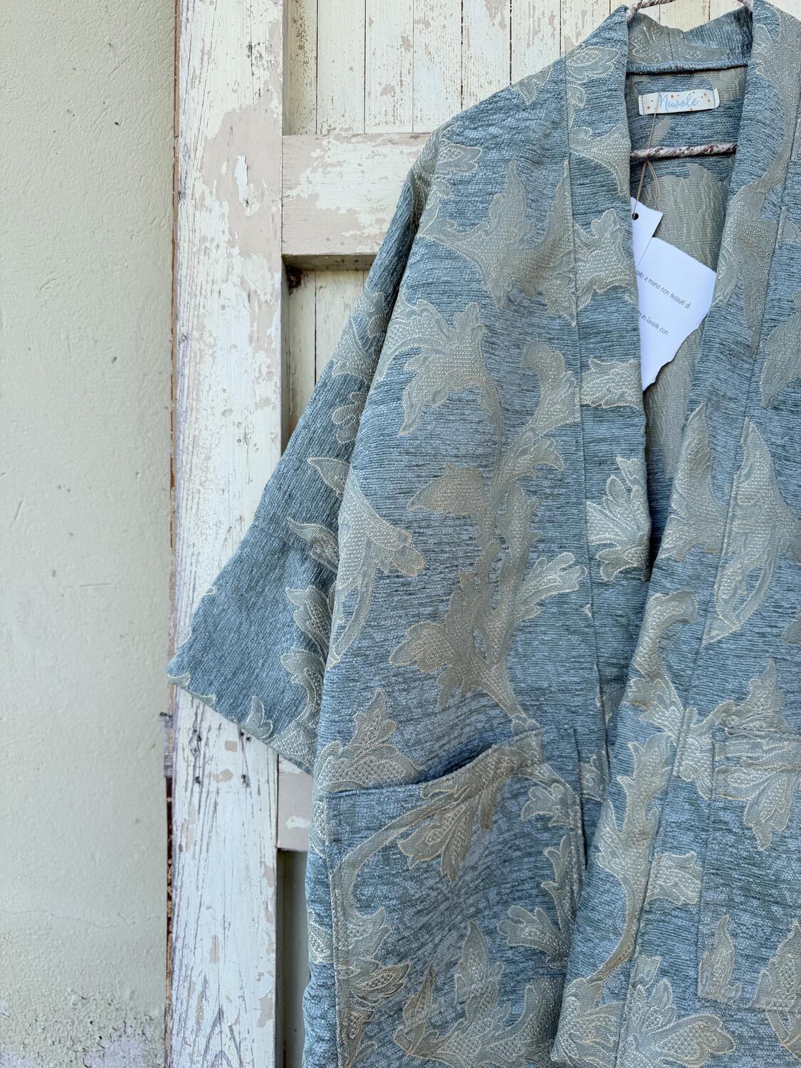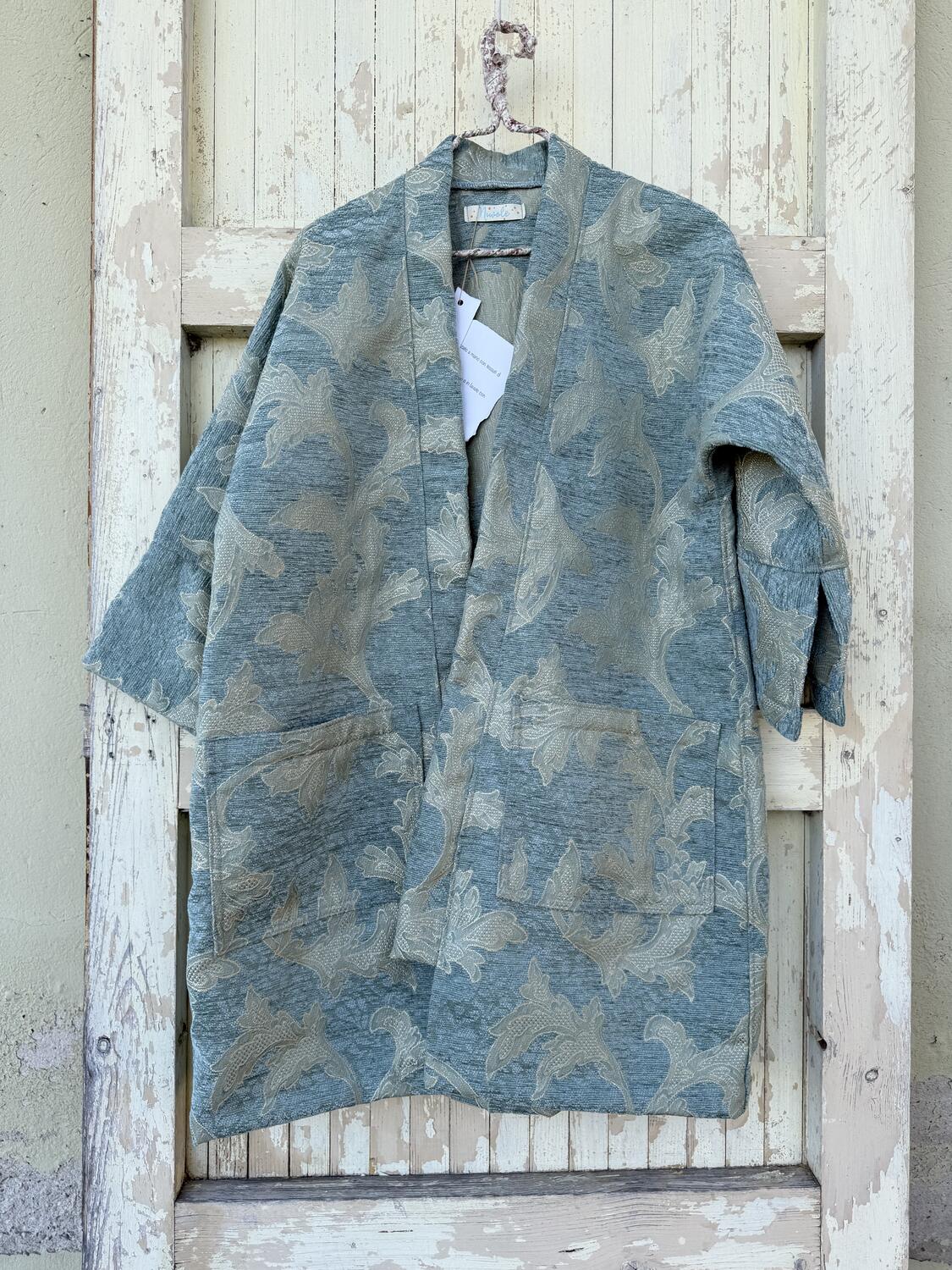 Kimono realizzato in tessuto di tappezzeria di peso medio, perfetto per le mezze stagioni o, durante i periodi piu freddi, accompagnato da una sciarpona