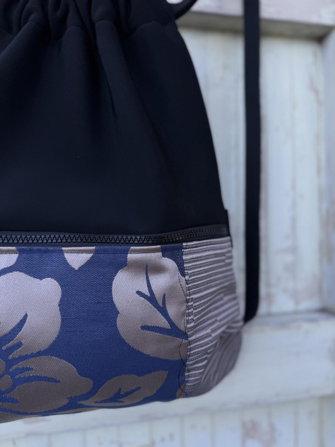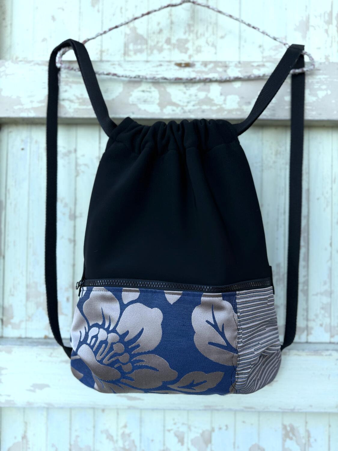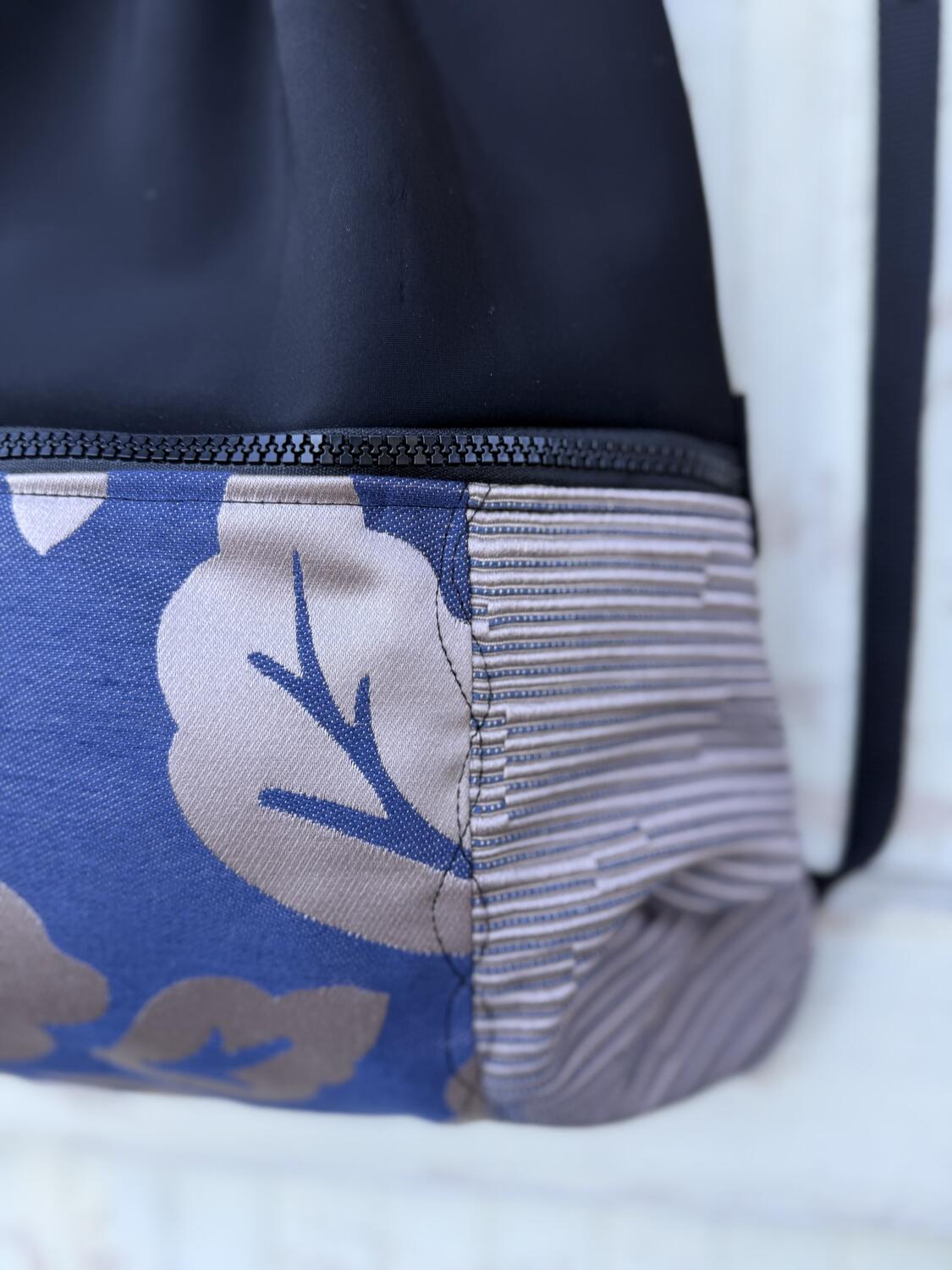 Lo zaino è realizzato tessuto di Tapezzeria, tessuto tecnico da abbigliamento sportivo e similpelle d’arredo.