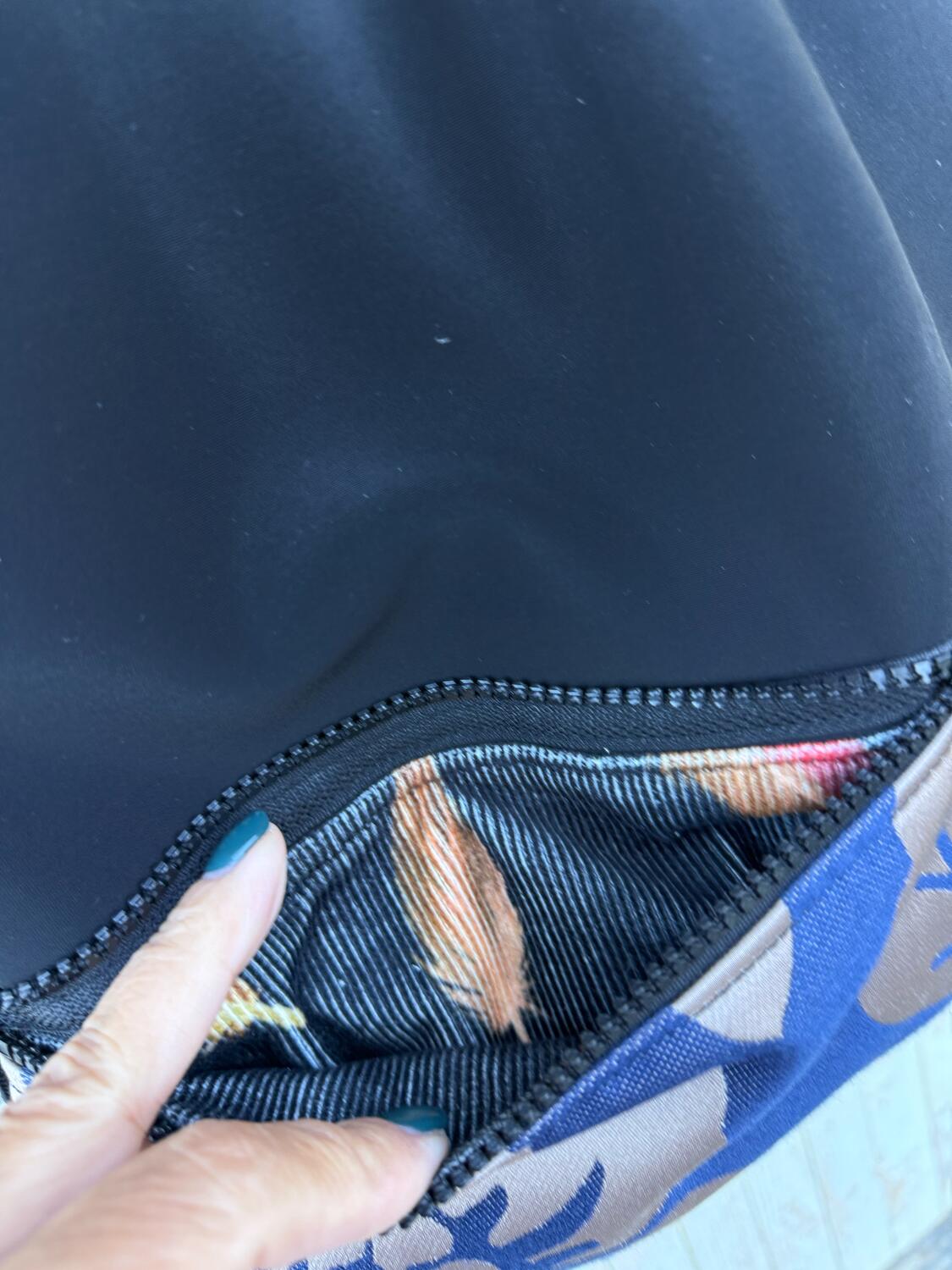 Ha una tasca esterna con cerniera e due tasche interne (aperte)